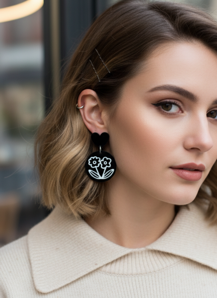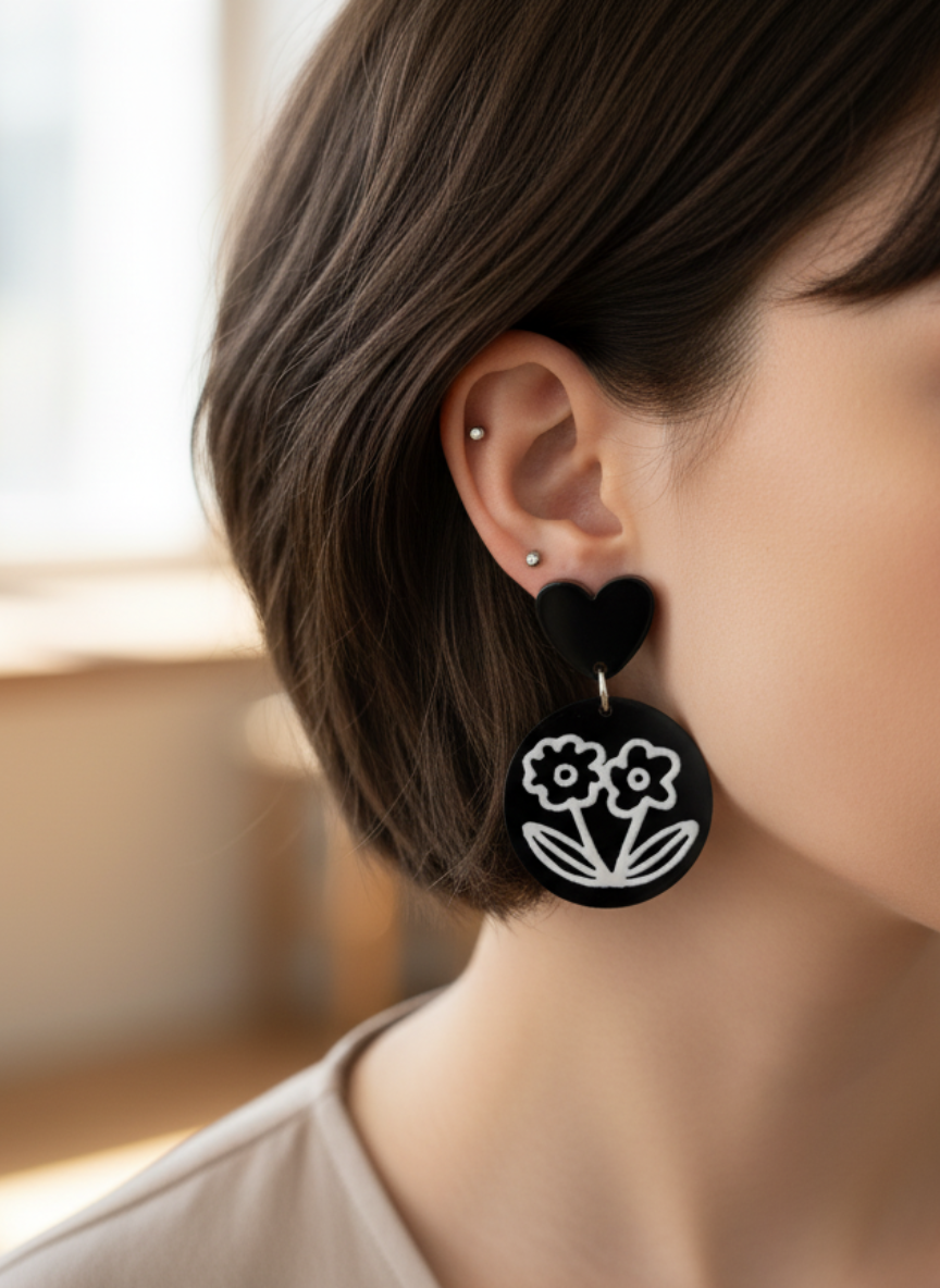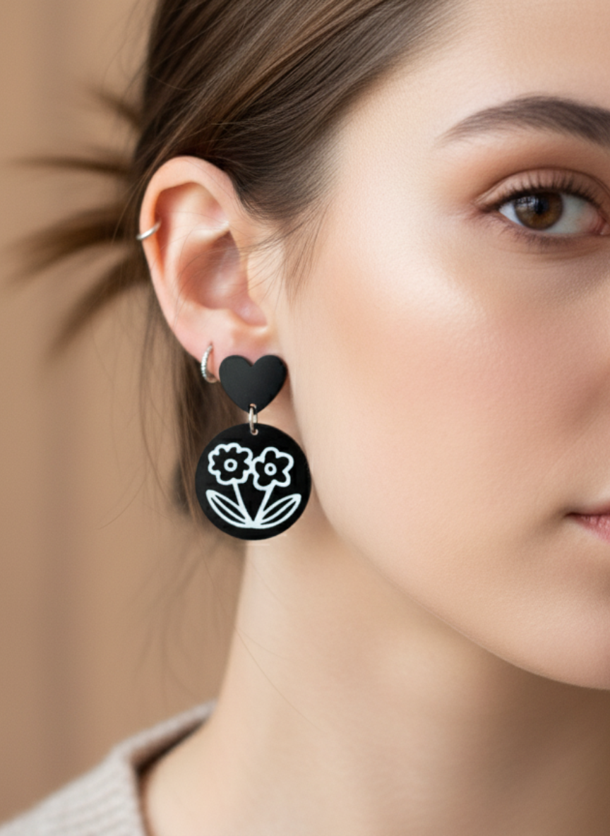 ¡Amor a primera vista! 😍 Estos aros modernos son la combinación perfecta de ternura y estilo vanguardista. Base de corazón negro 🖤 que cuelga de un dije redondo con un diseño floral minimalista en blanco 🌼. Ideales para darle un pop de personalidad a tu outfit diario.