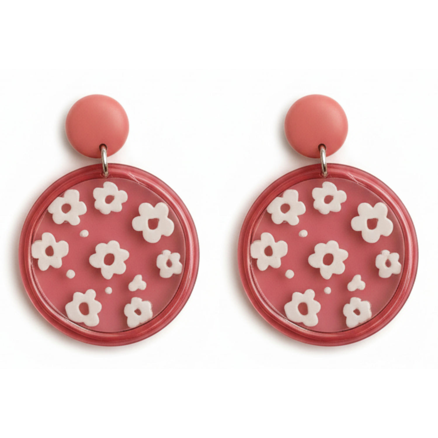 🌸 ¡Aros que te harán florecer! 🌸 Estos pendientes modernos de círculo son la dosis de color y ternura que necesitas. Su diseño en coral vibrante con margaritas blancas es puro estilo groovy. Ponte estos cuties y prepárate para brillar. ✨