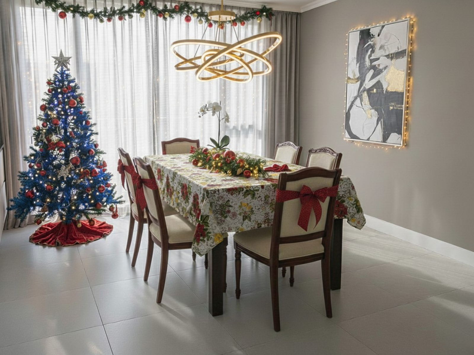Con un vibrante diseño de Nochebuenas rojas, adornos festivos y un sutil toque de brillo que captura la luz, este mantel no solo protege tu mesa, sino que la convierte en una obra de arte. Perfecto para cenas de Nochebuena, comidas de Navidad o cualquier reunión especial.